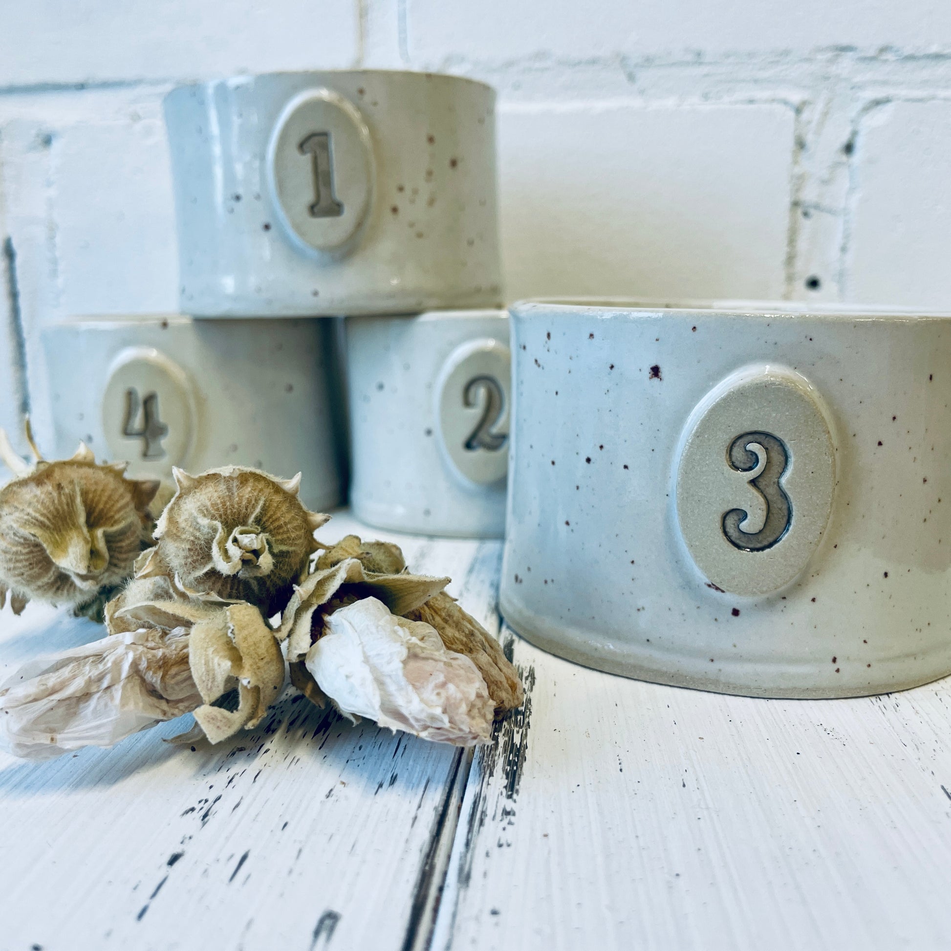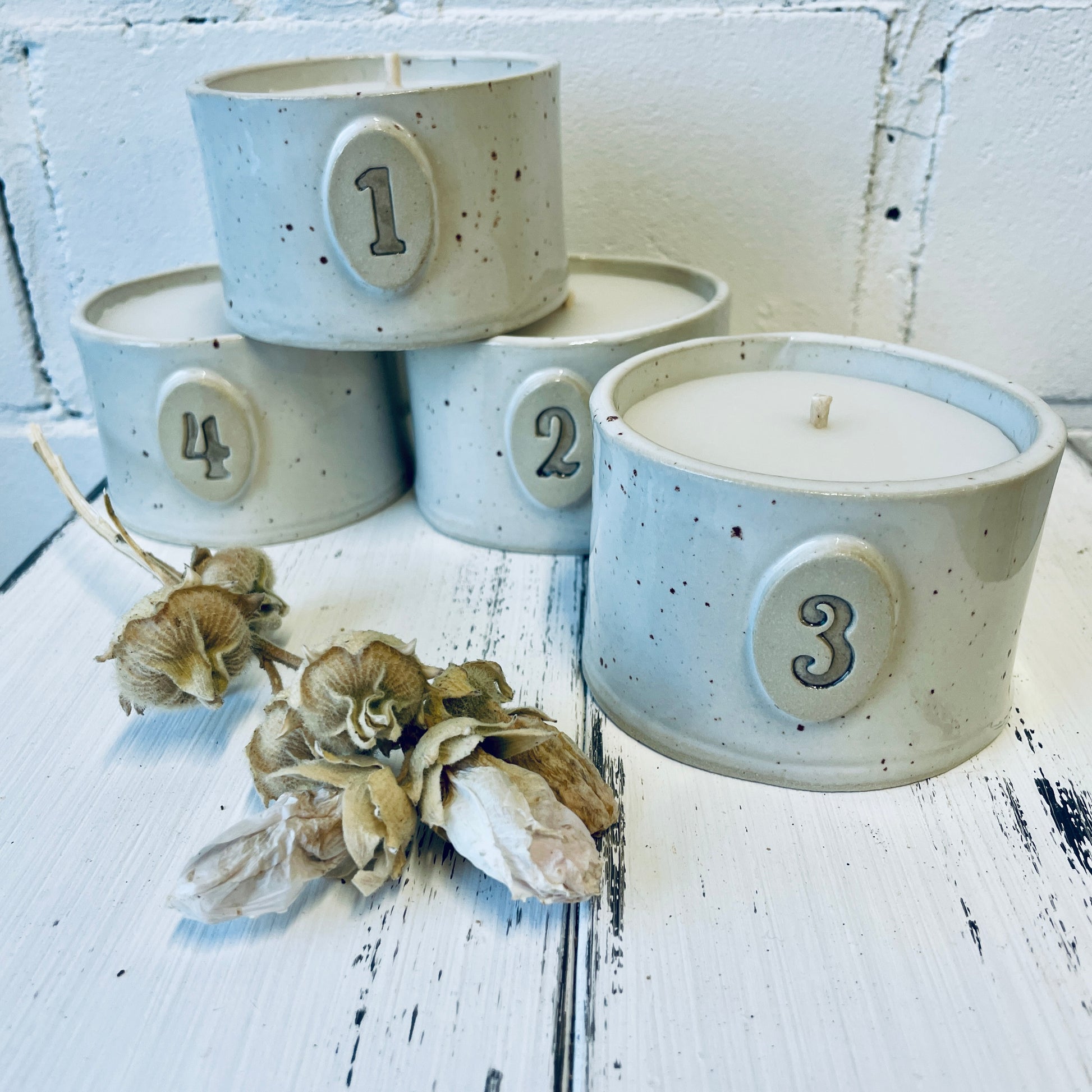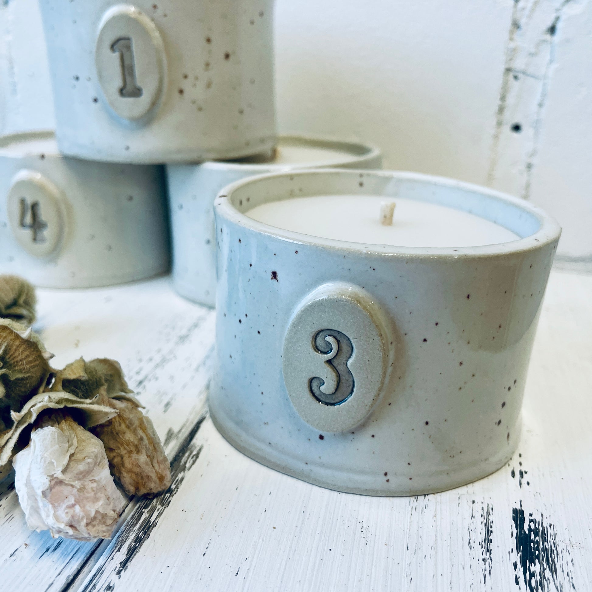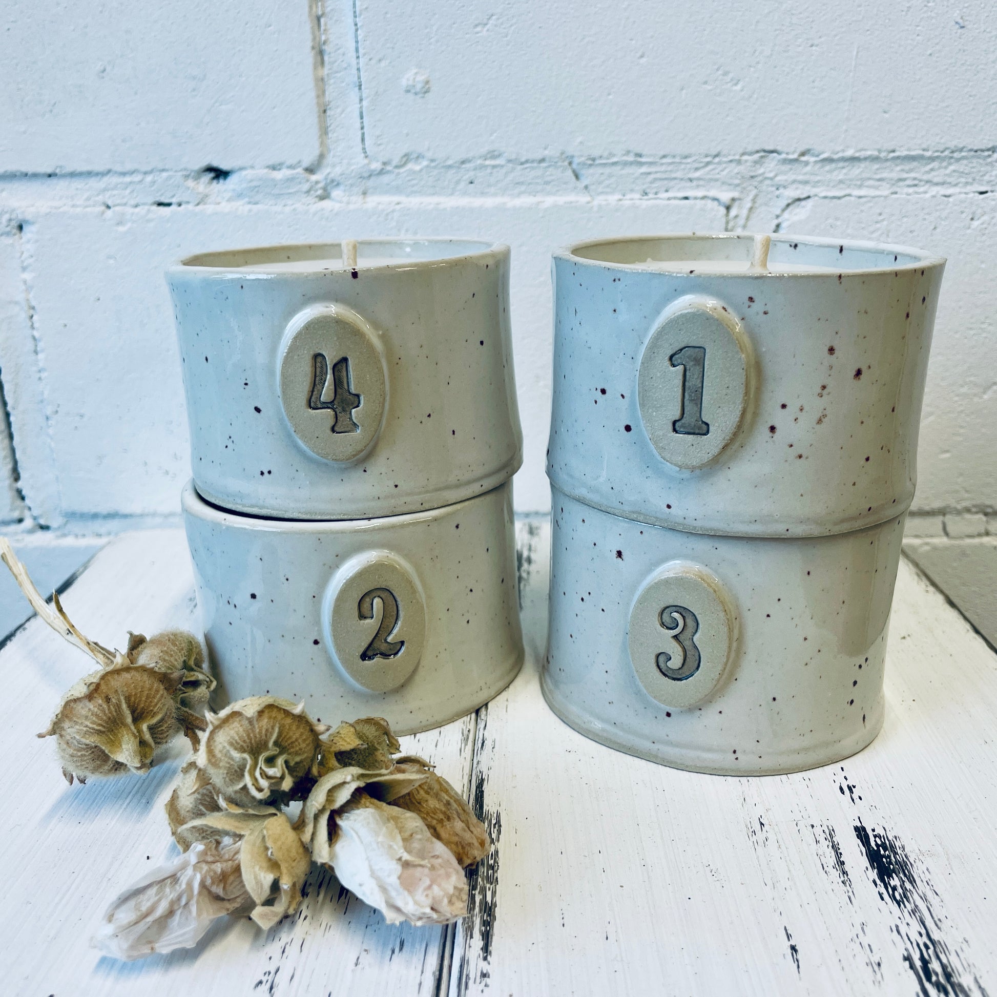 Jeder Becher ist ein Unikat, liebevoll getöpfert und mit einer Zahl (1–4) versehen – perfekt für deinen individuellen Adventskranz oder als stilvolle Einzeldekoration.