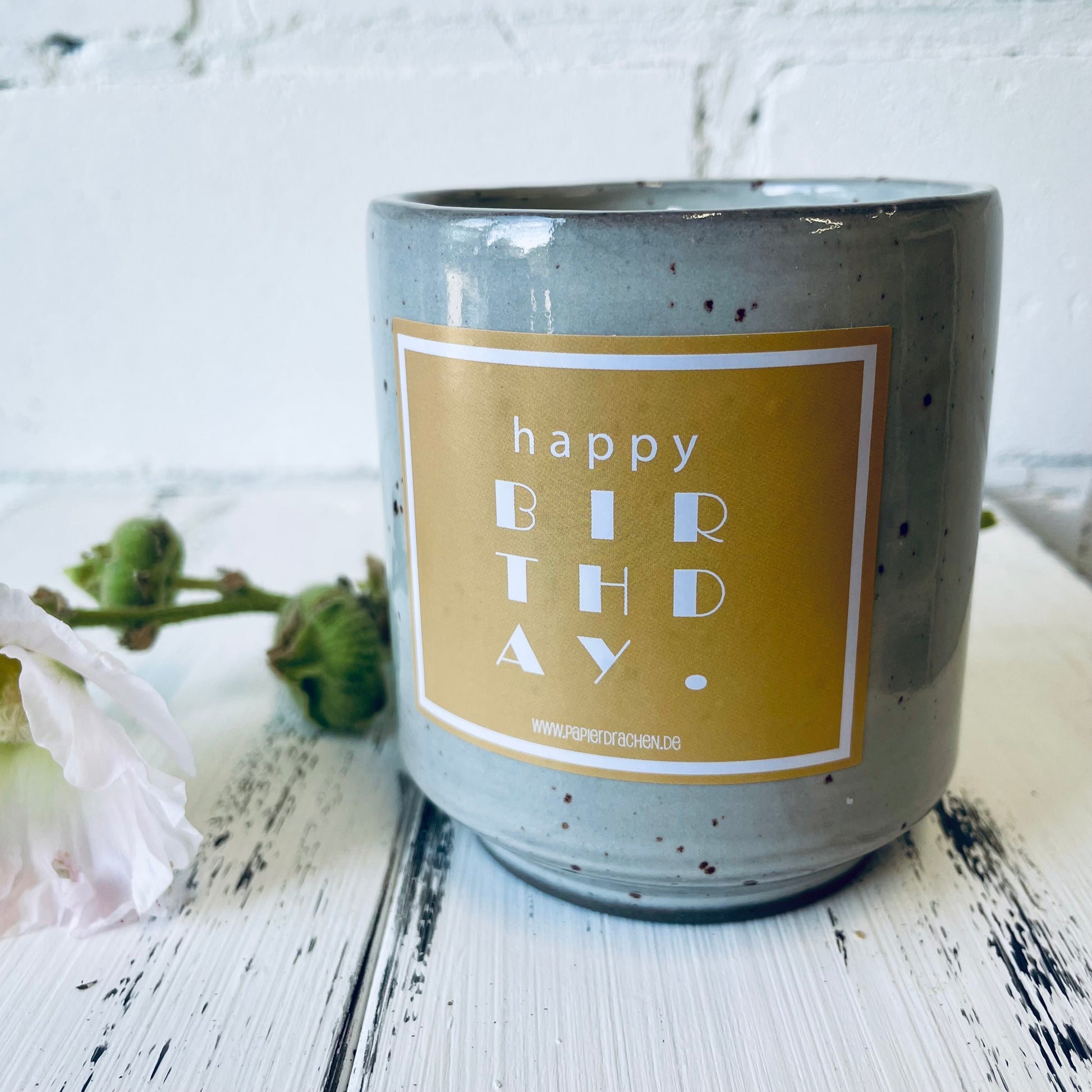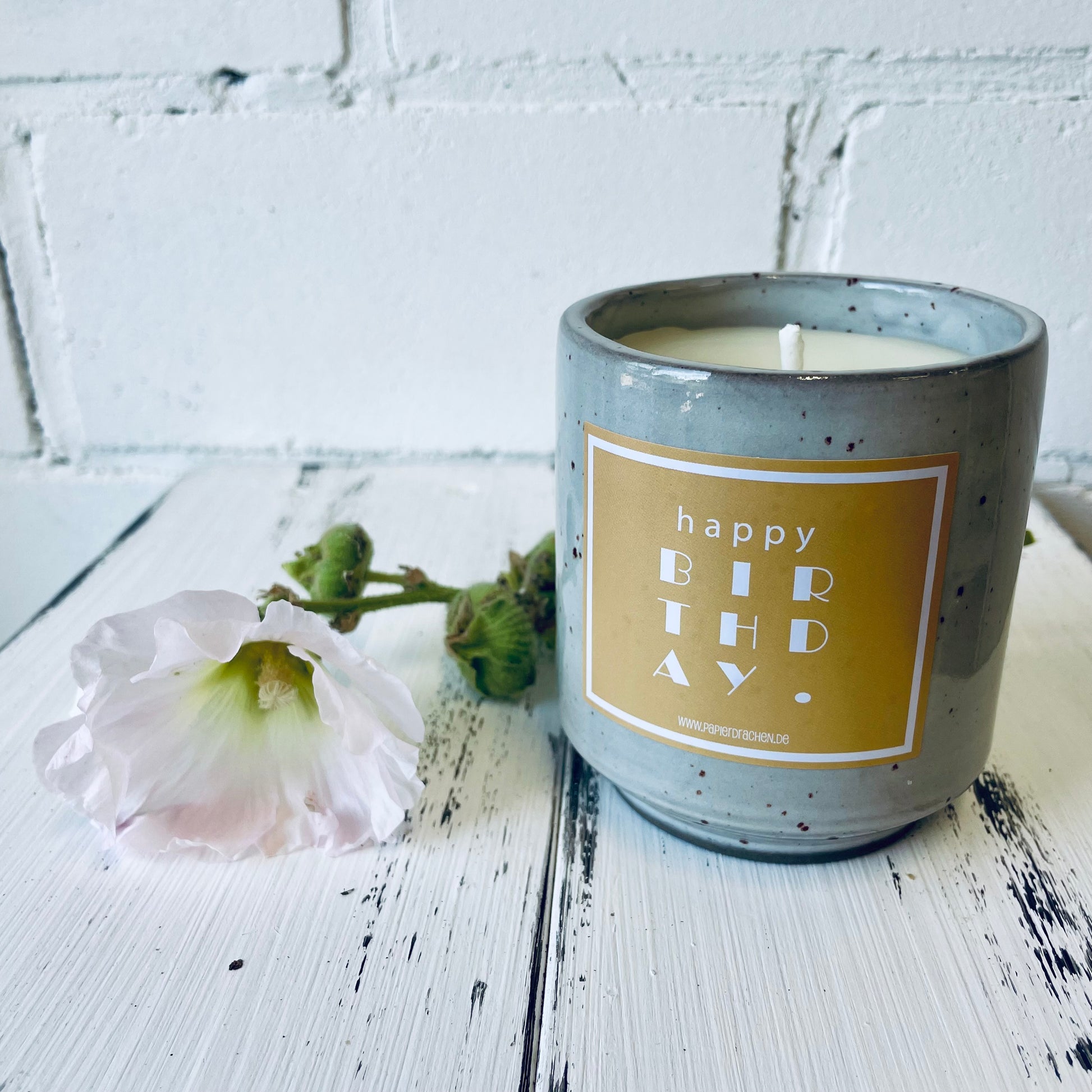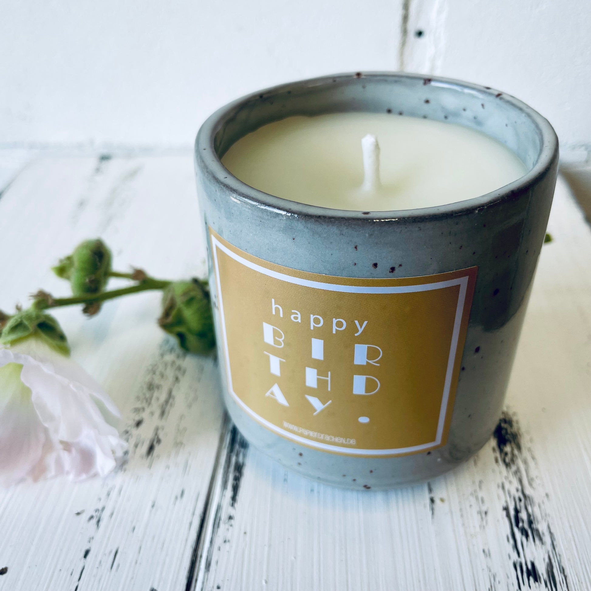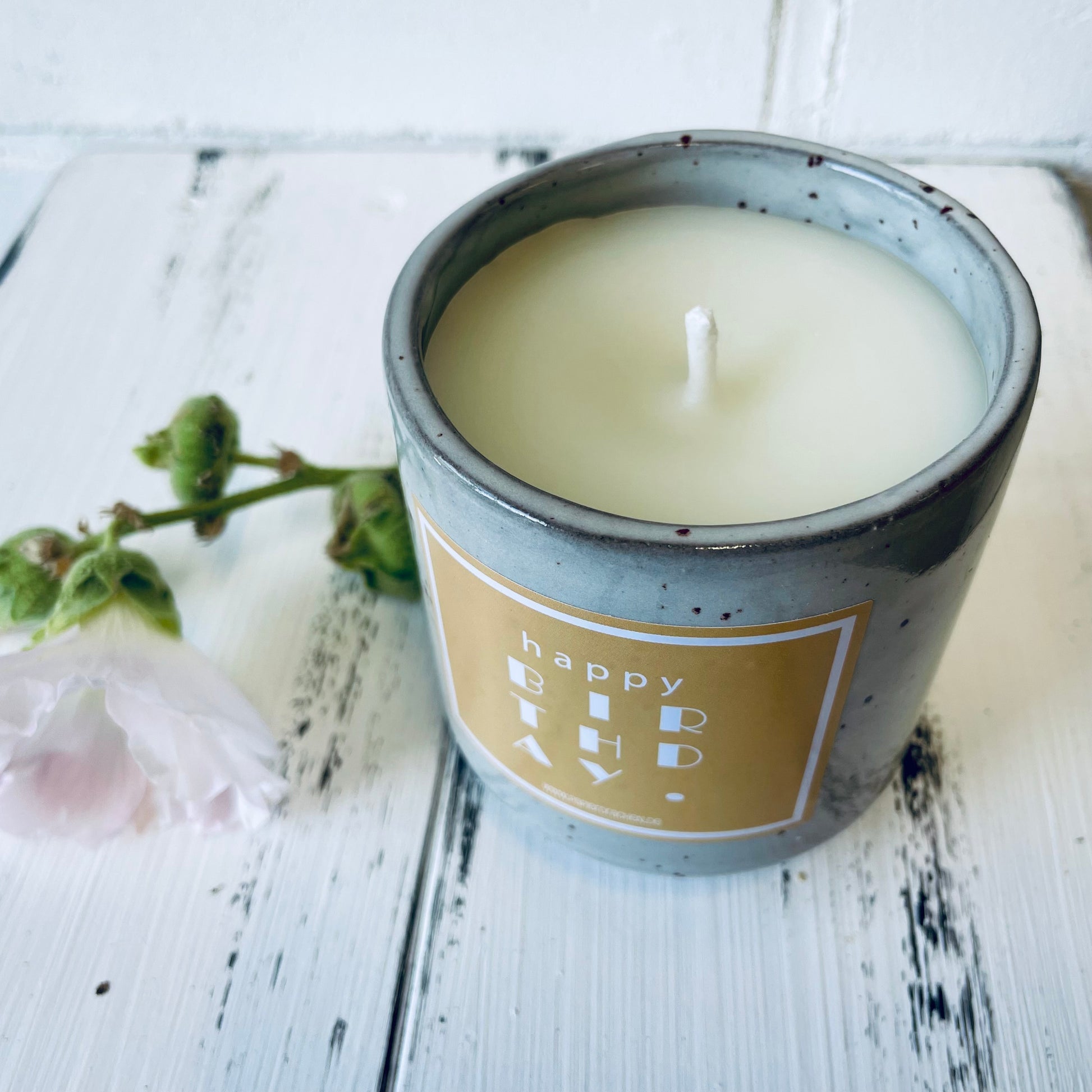 Geburtstagskerze – „Happy Birthday“, witzige Kerze, Bienenwachskerze, Steinzeugkeramik