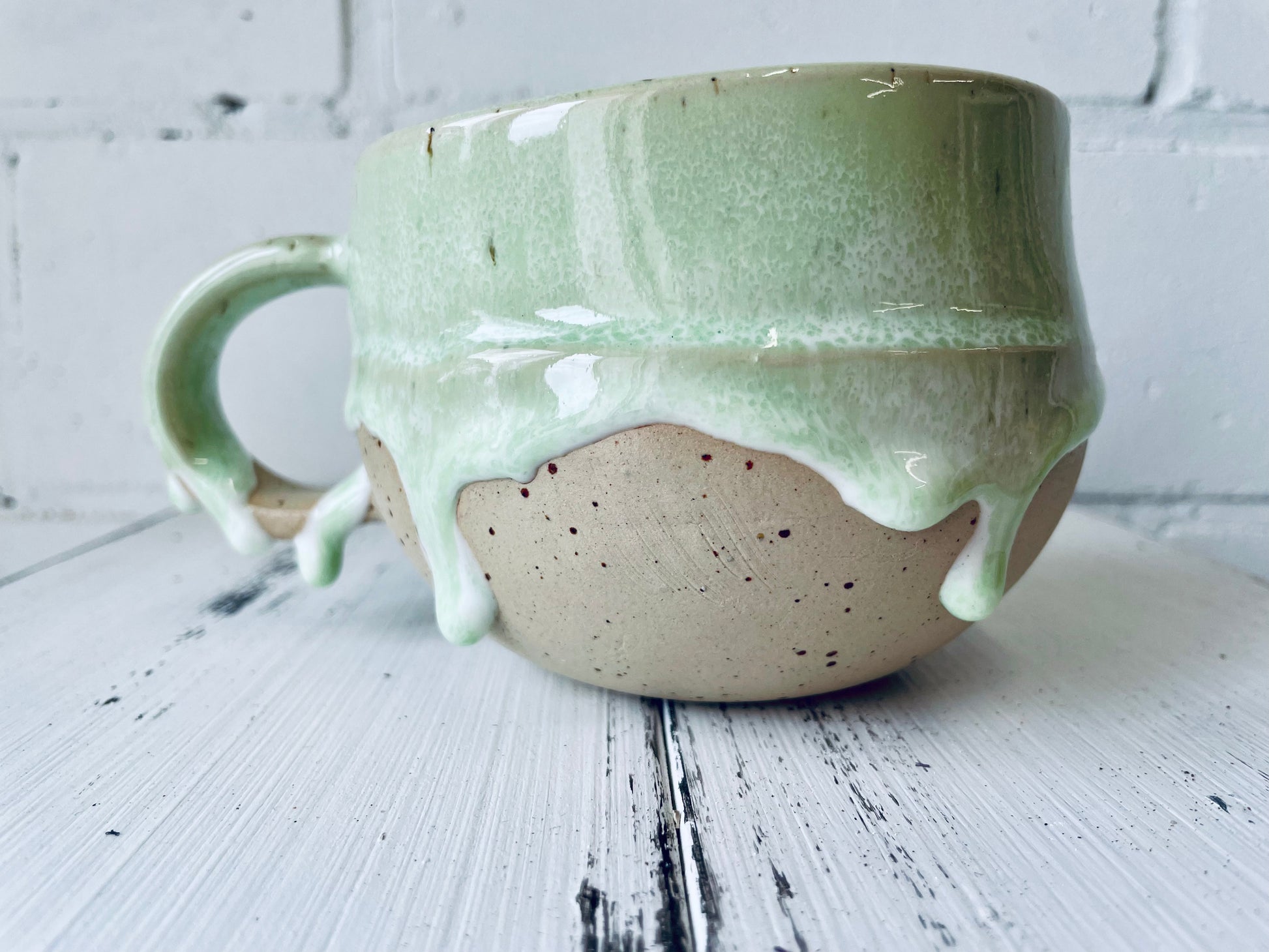 Details • Material: Hochwertiges Steinzeug • Glasur: Sanftes Grün oder leuchtendes lila mit fließenden Tropfen, jedes Stück ein Unikat • Füllmenge: ca. 400 ml • Spülmaschinen- & mikrowellengeeignet • 100 % handgefertigt in meiner Werkstatt