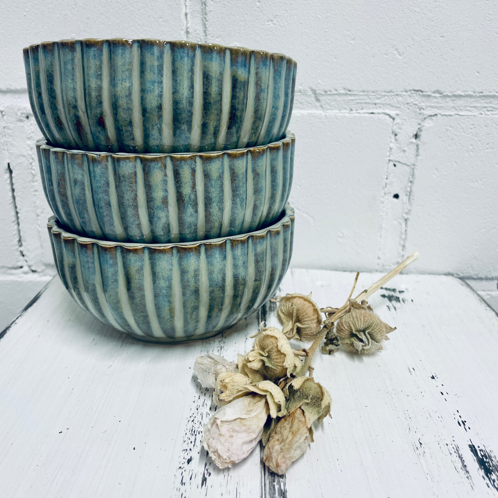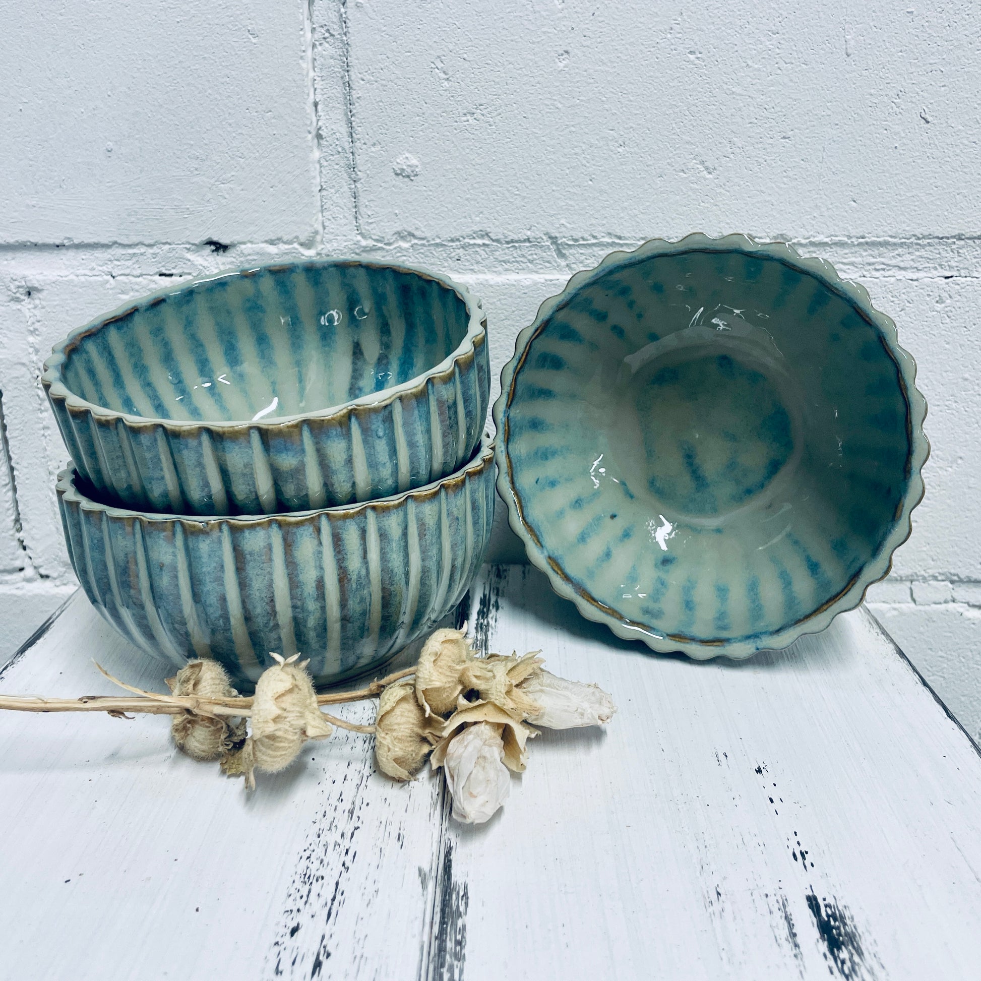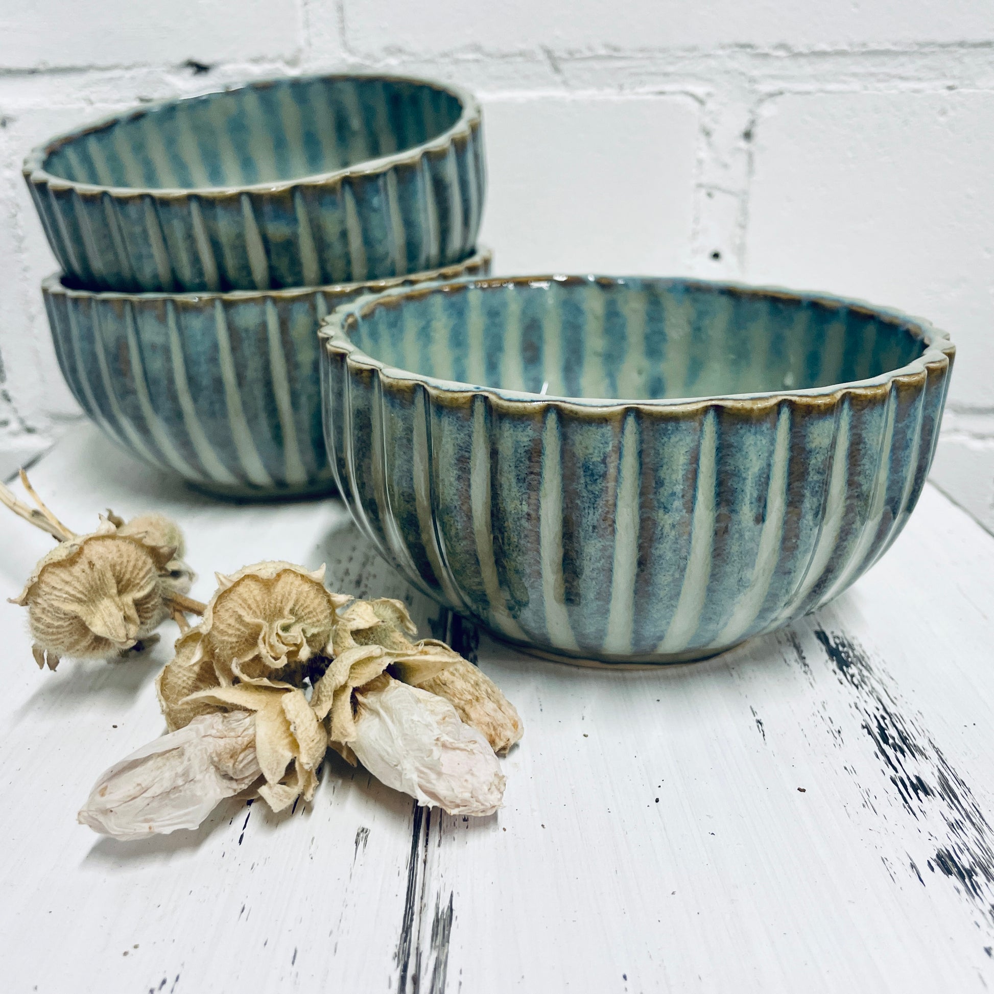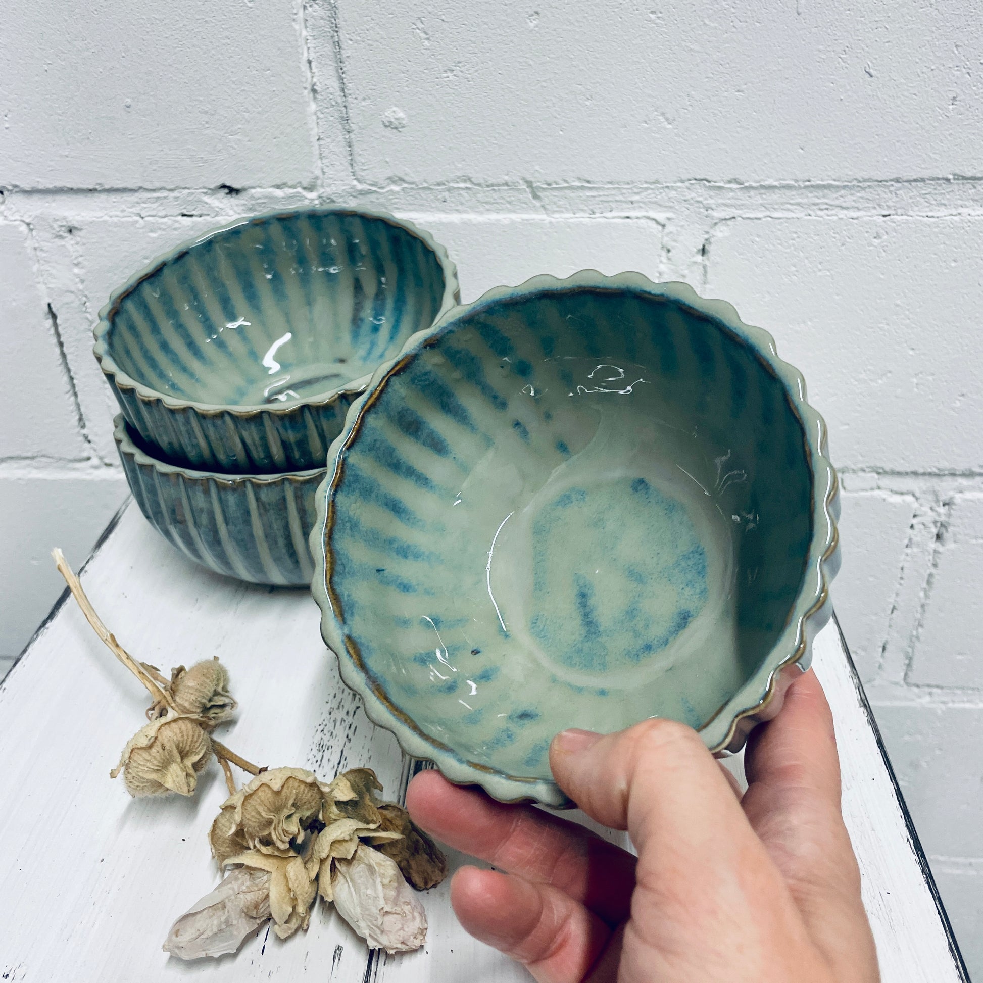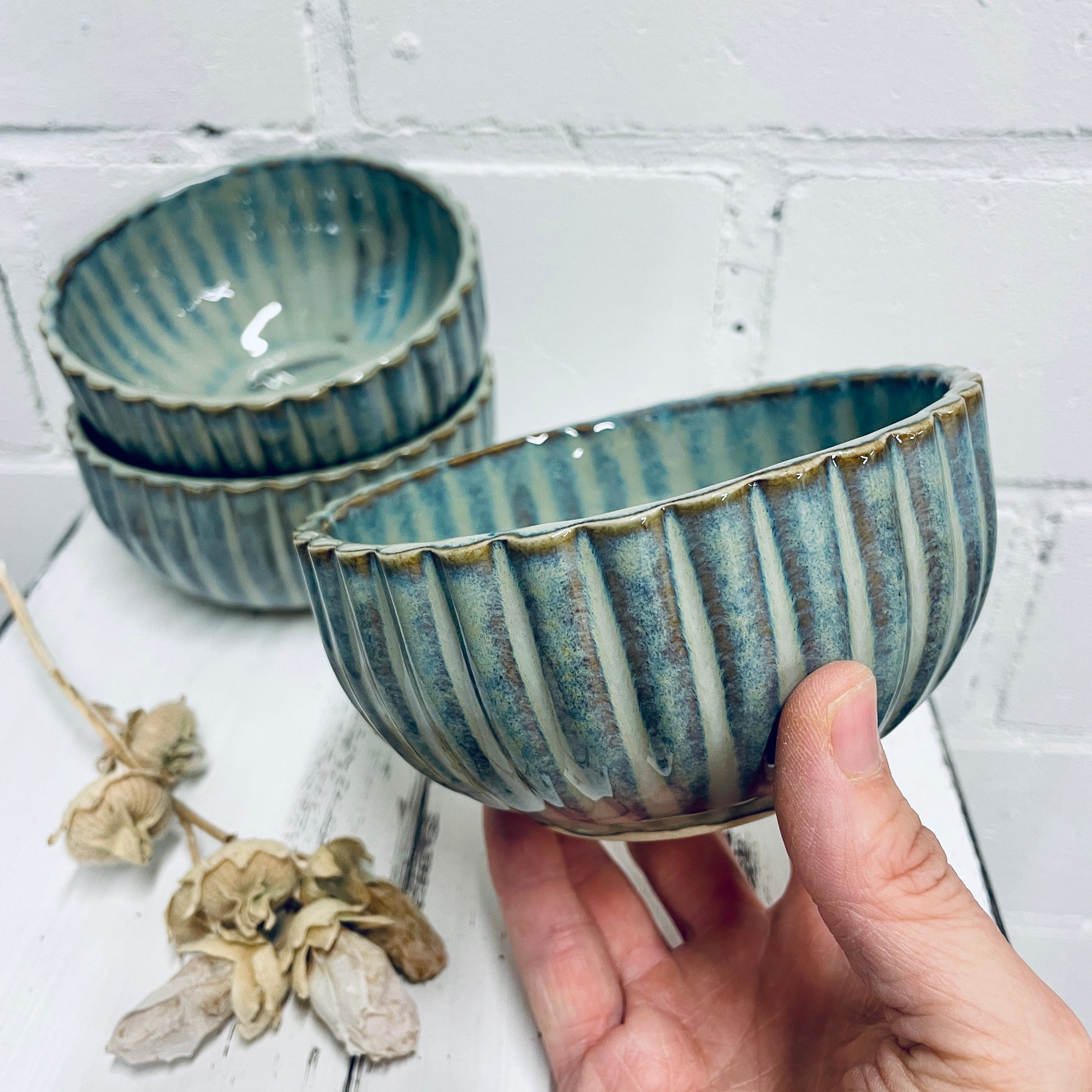 Jede dieser Müslischüsseln wird in liebevoller Handarbeit in meiner kleinen Werkstatt in Nordfriesland gefertigt. Das feine, senkrechte Rillenmuster und die schimmernde Glasur in Blau-Grün machen jede Schale zu einem echten Unikat.