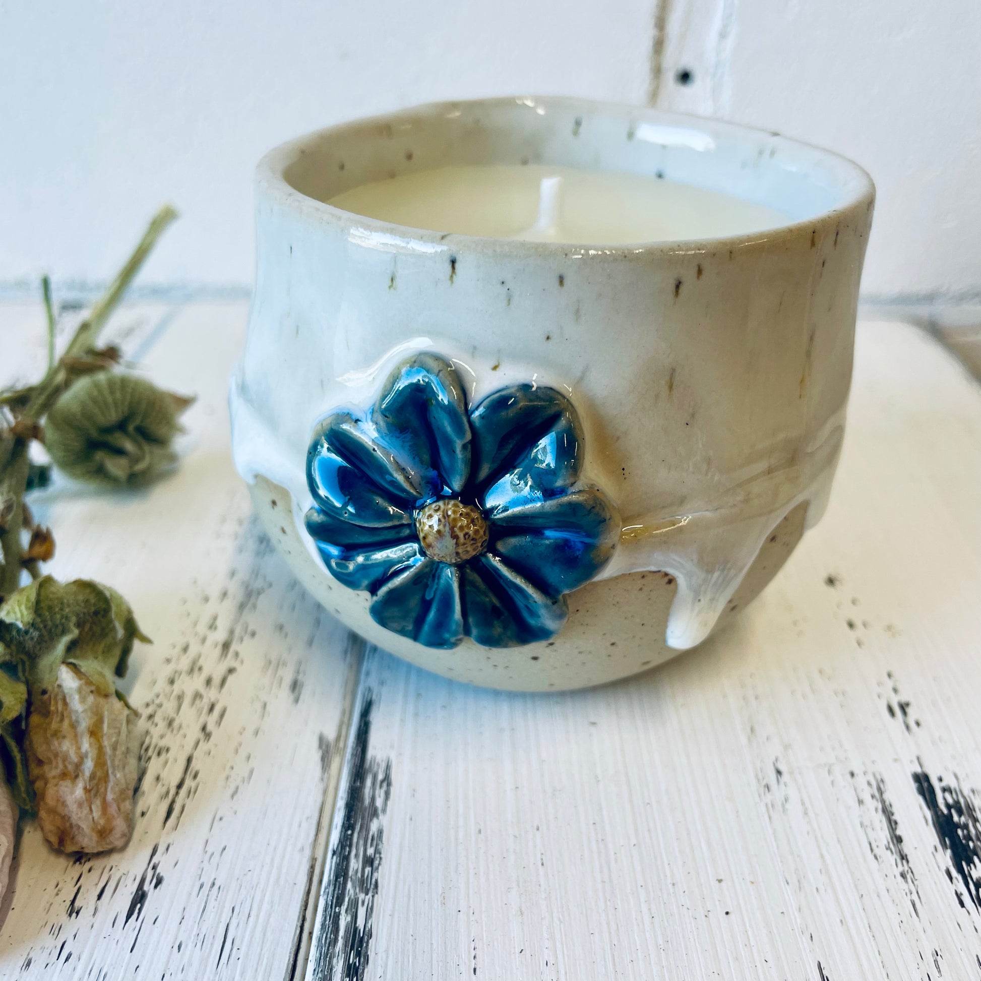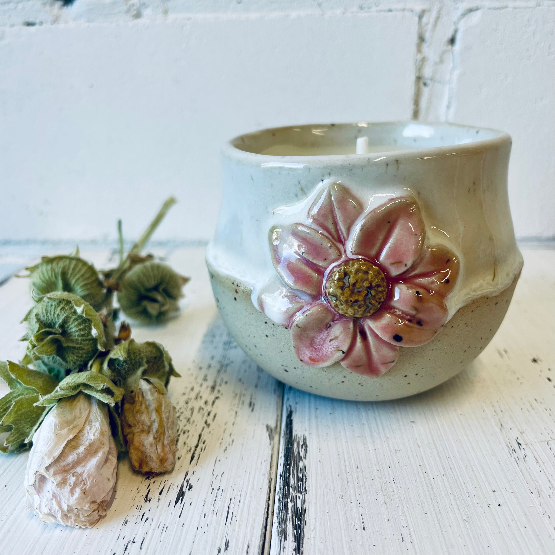 Handgemachte Kerze in Keramiktasse mit Blüten-Relief, Steinzeugkeramik, Bienenwachskerze