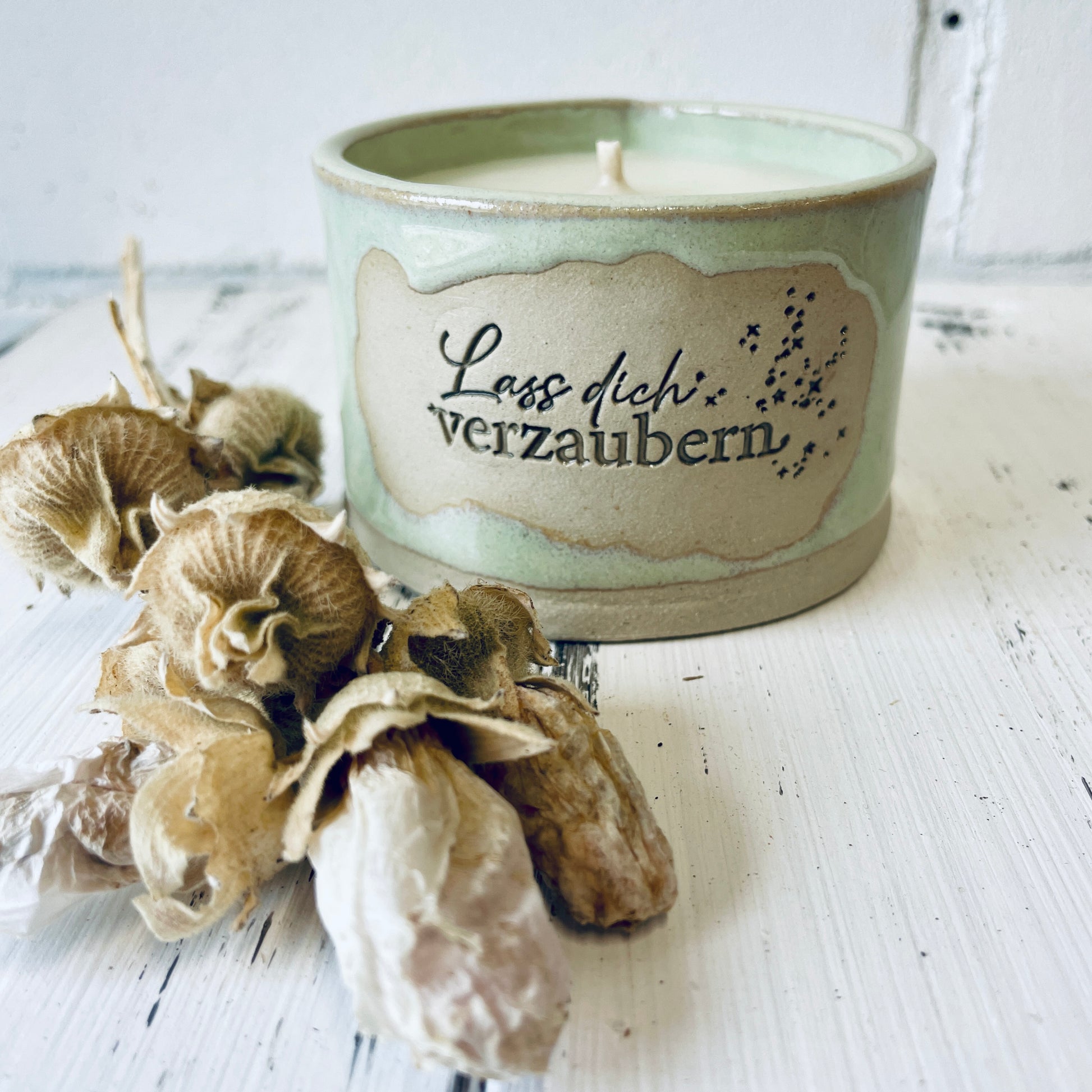 Diese besondere Kerze ist in einem von mir getöpferten Becher gegossen, der mit dem Spruch „lass dich verzaubern“ versehen ist – perfekt für alle, die einfach mal danke sagen wollen.