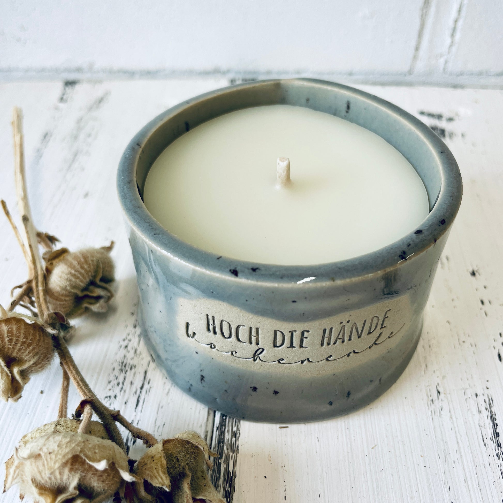 Diese besondere Kerze ist in einem von mir getöpferten Becher gegossen, der mit dem Spruch „Hoch die Hände Wochenende “ versehen ist – perfekt für alle, die einfach mal danke sagen wollen.