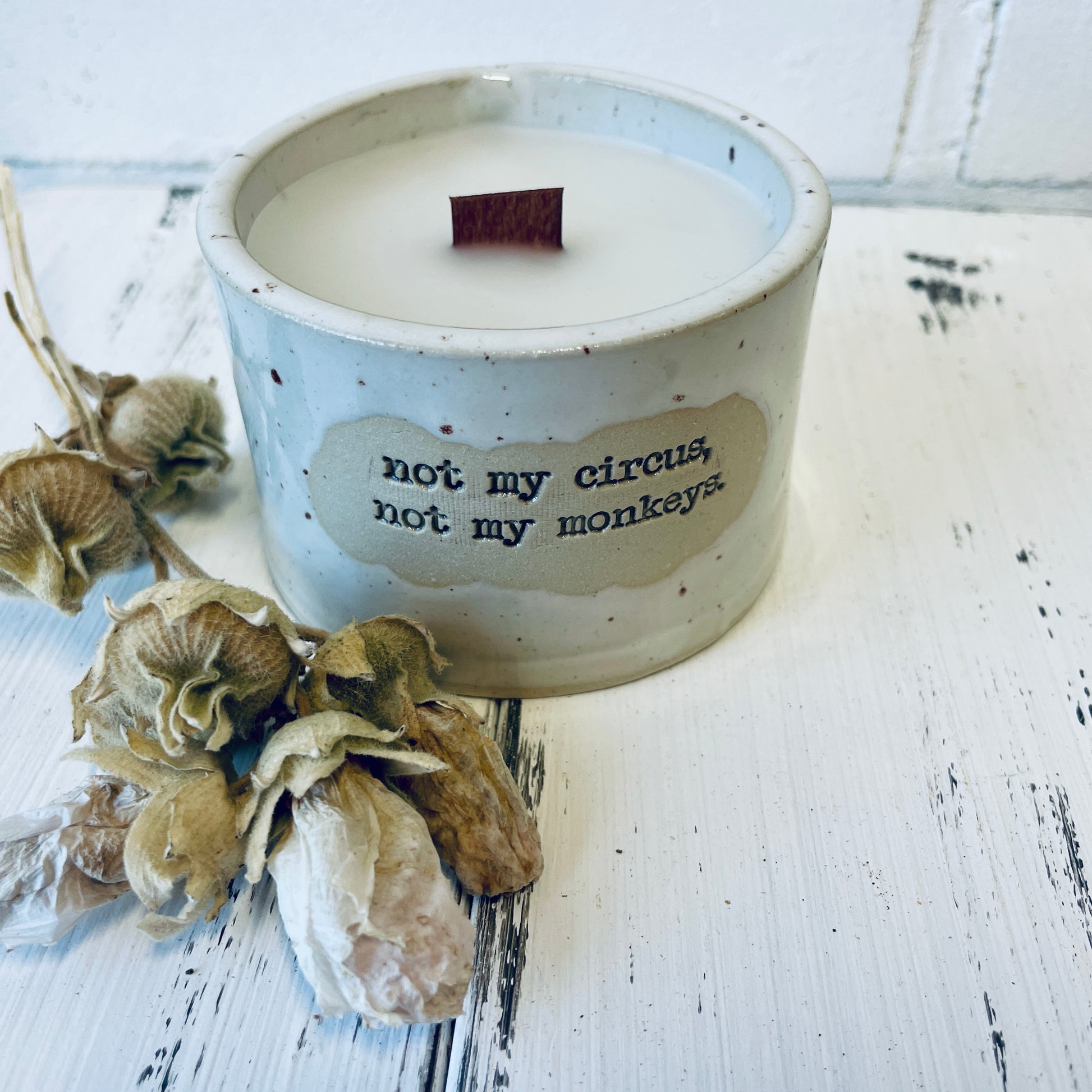 Diese besondere Kerze ist in einem von mir getöpferten Becher gegossen, der mit dem Spruch „not my circus, not my monkeys“ versehen ist – perfekt für alle, die Humor und Gelassenheit lieben.