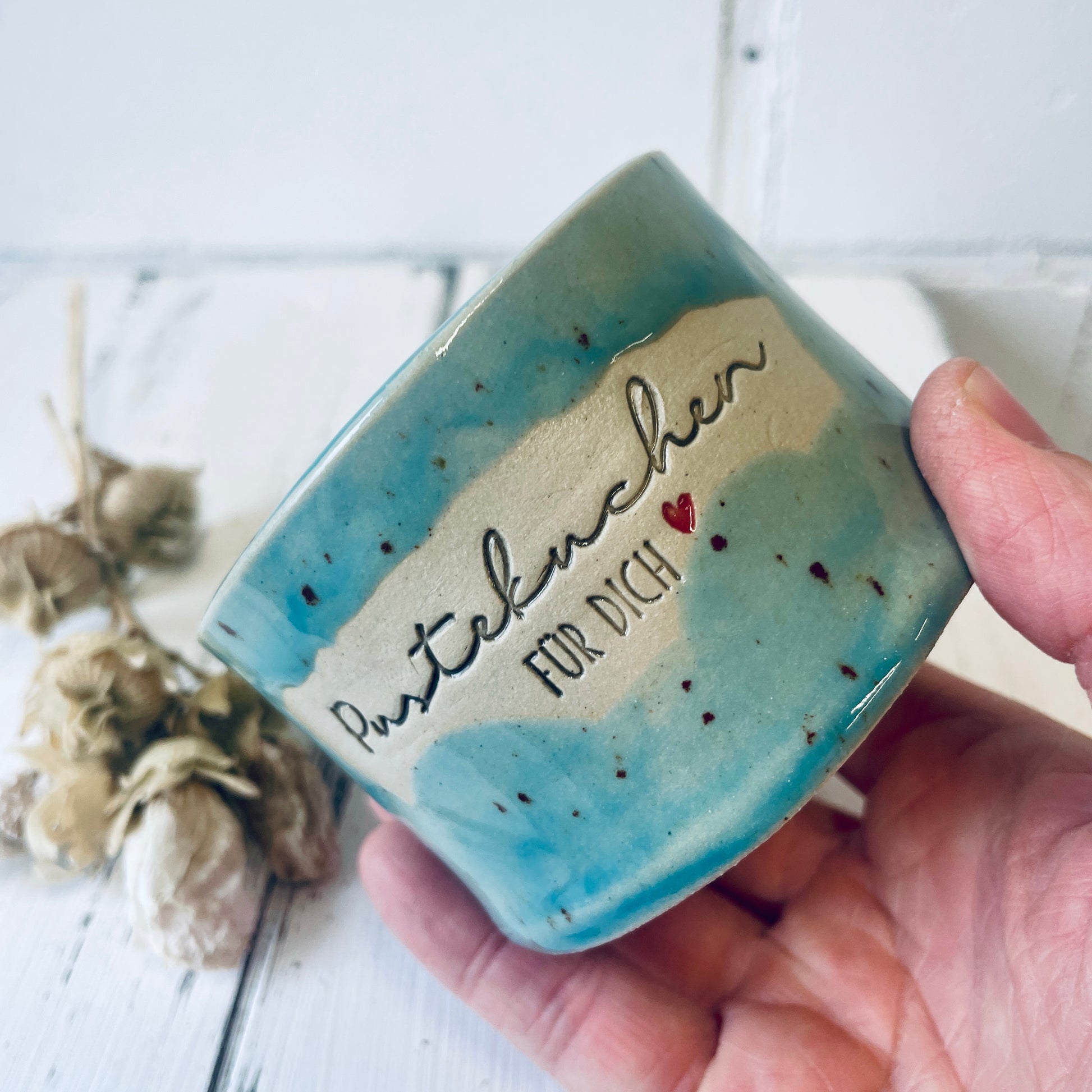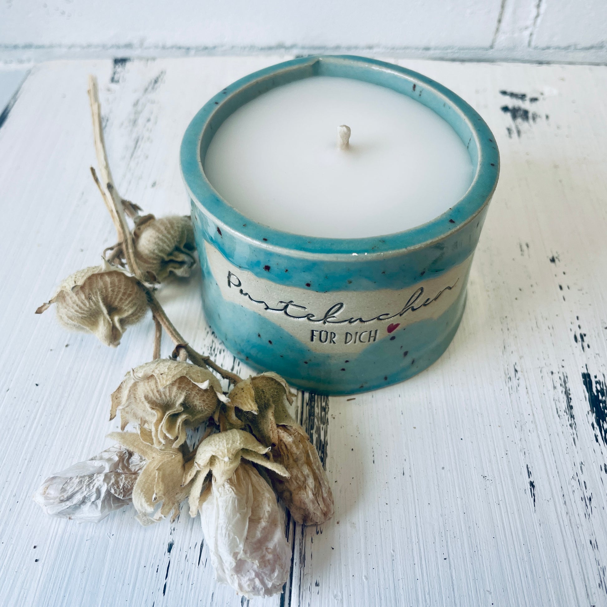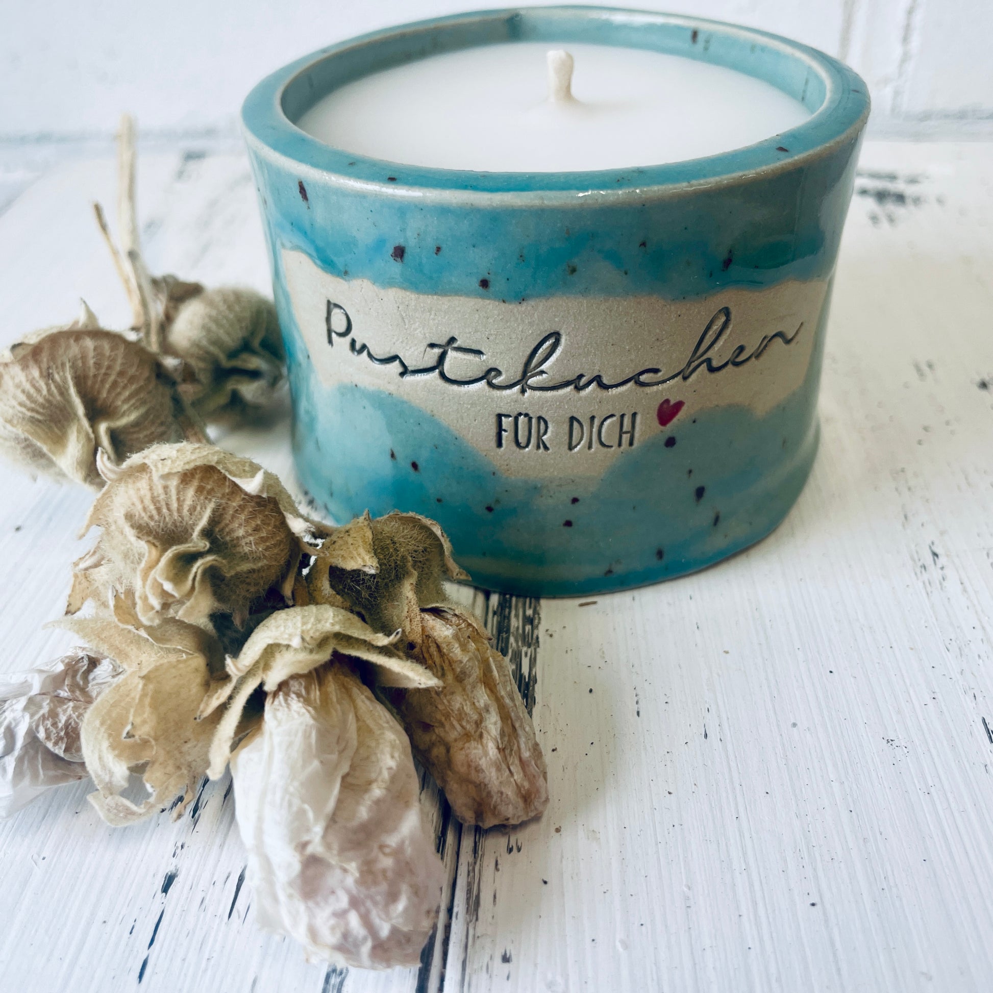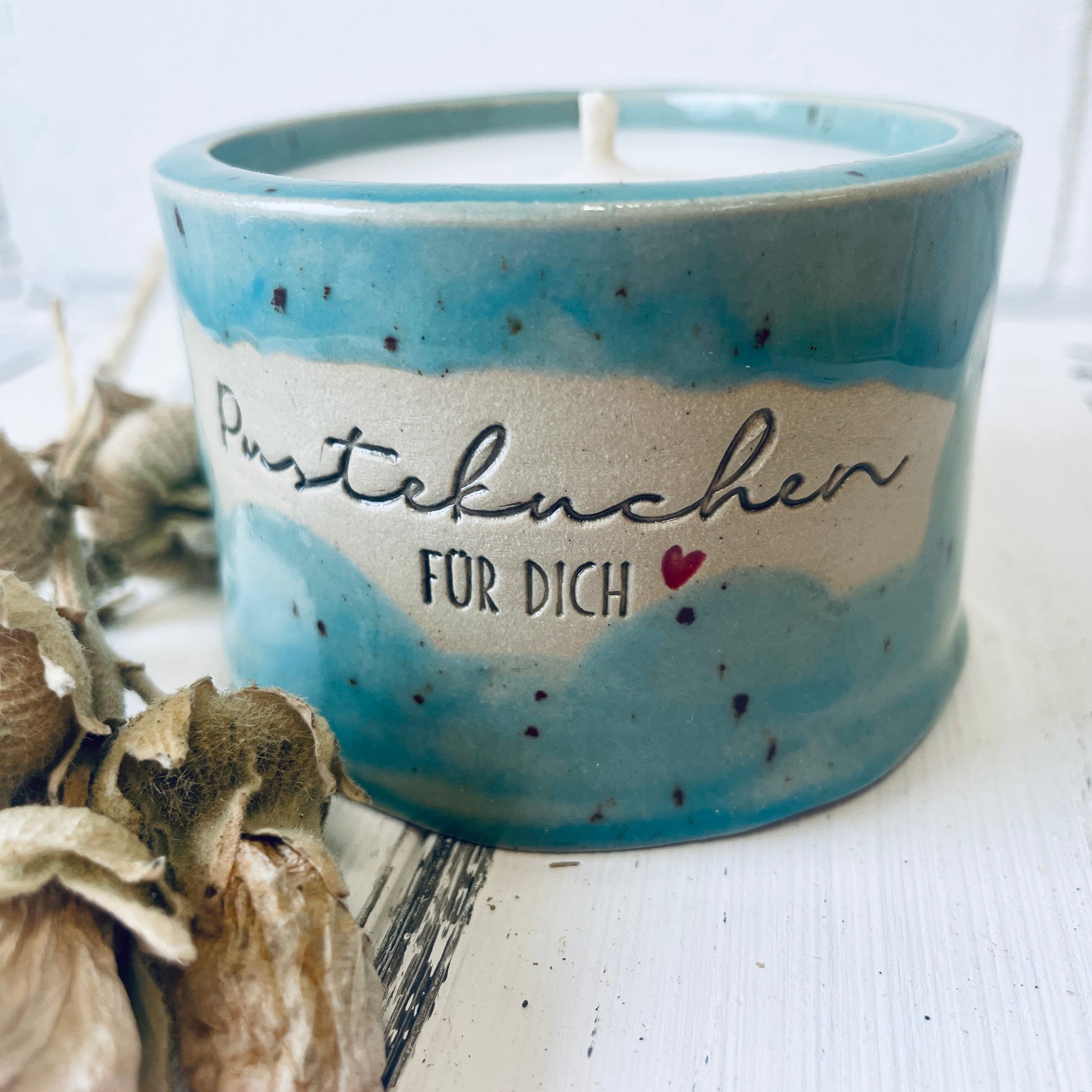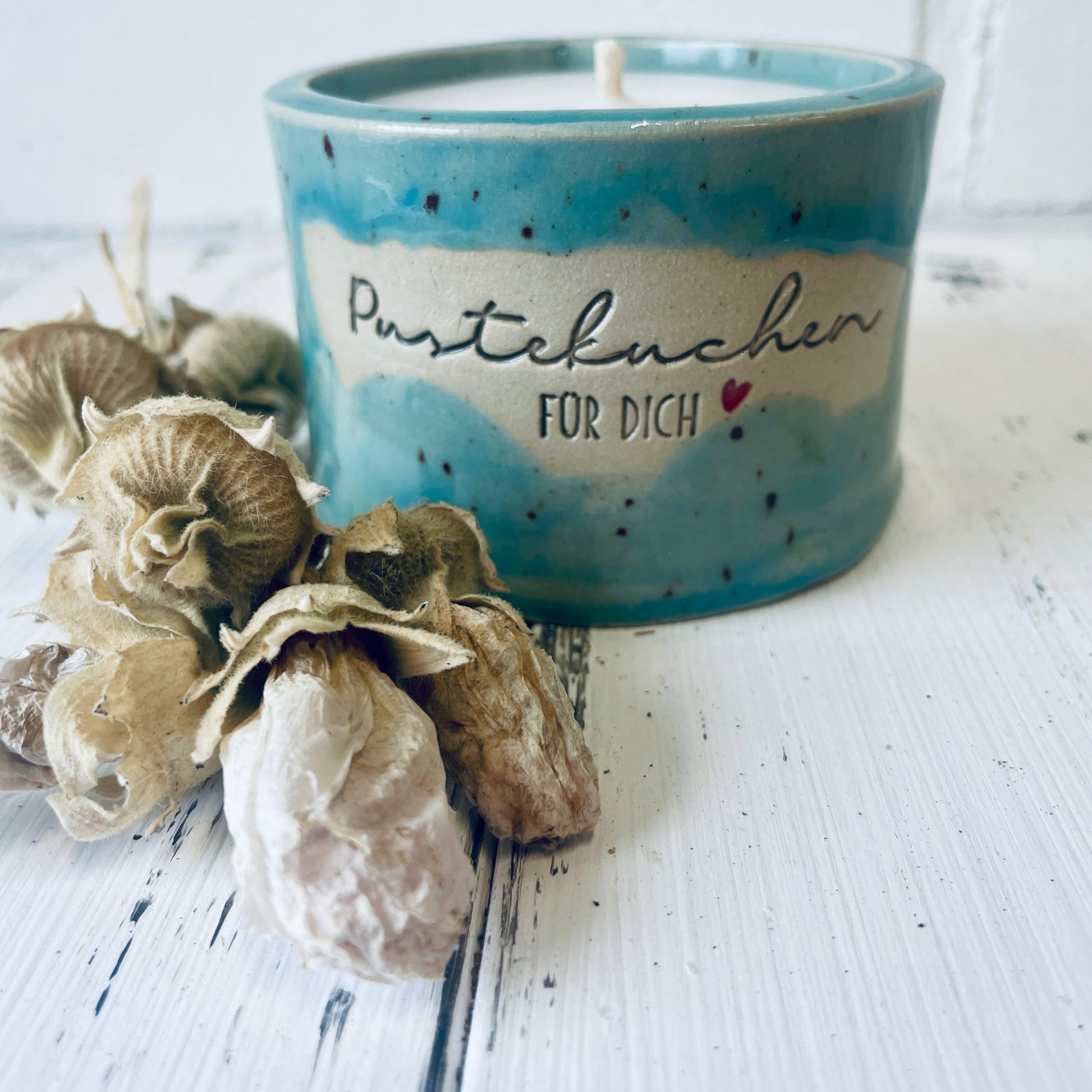 Diese besondere Kerze ist in einem von mir getöpferten Becher gegossen, der mit dem Spruch „Pustekuchen für Dich“ versehen ist – perfekt für alle, die einfach mal danke sagen wollen.