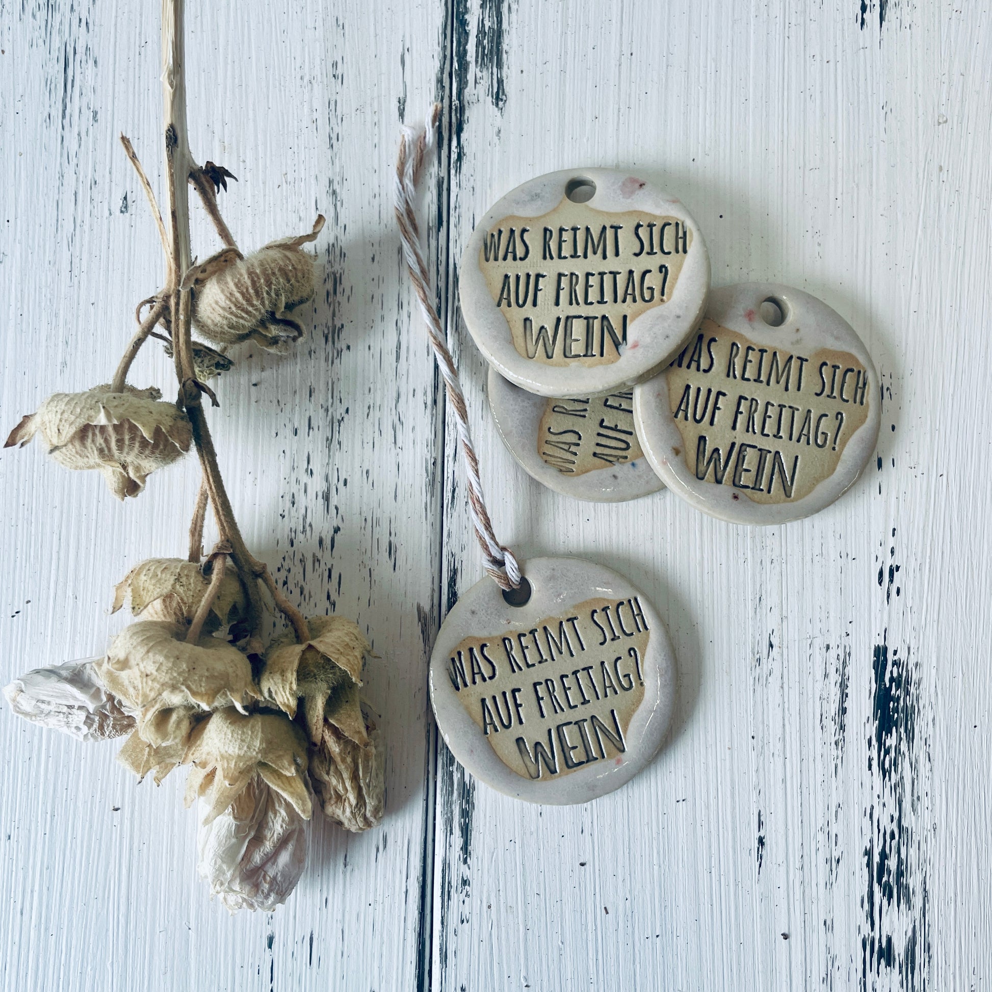 Keramikanhänger – „Was reimt sich auf Freitag? Wein“