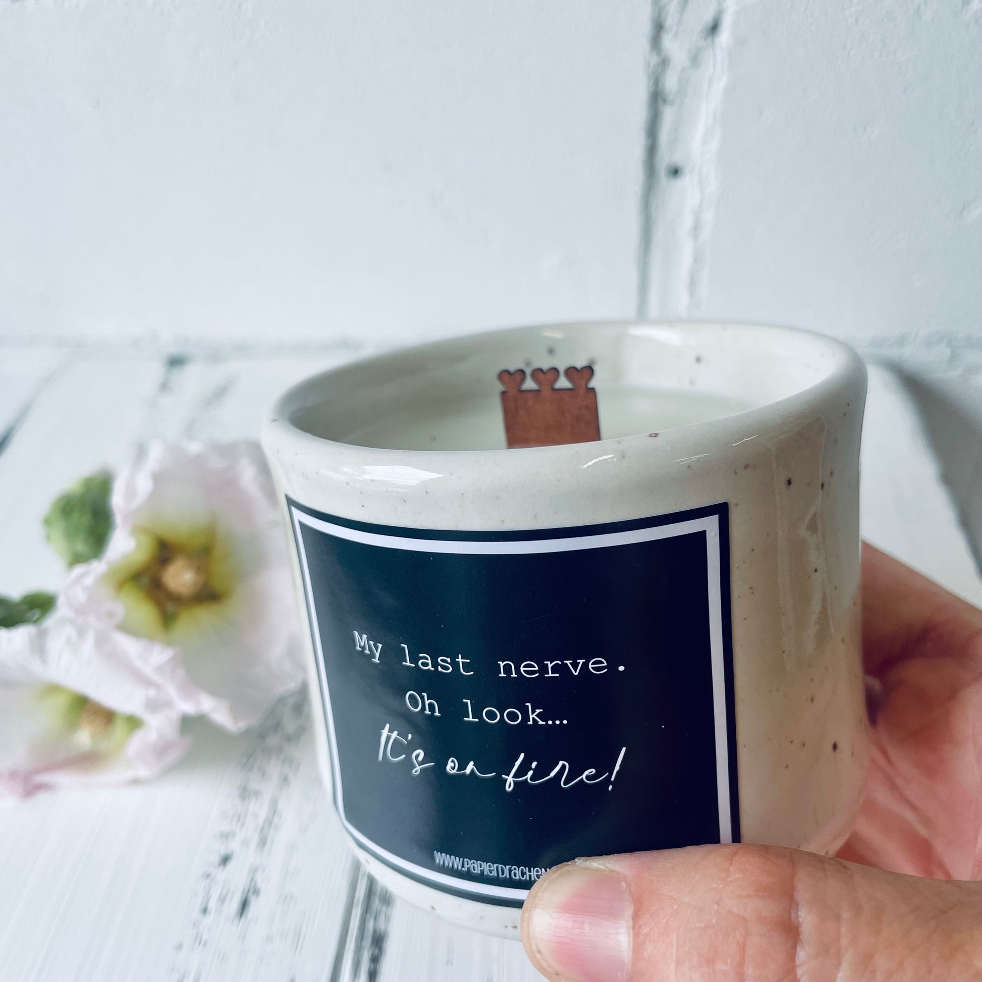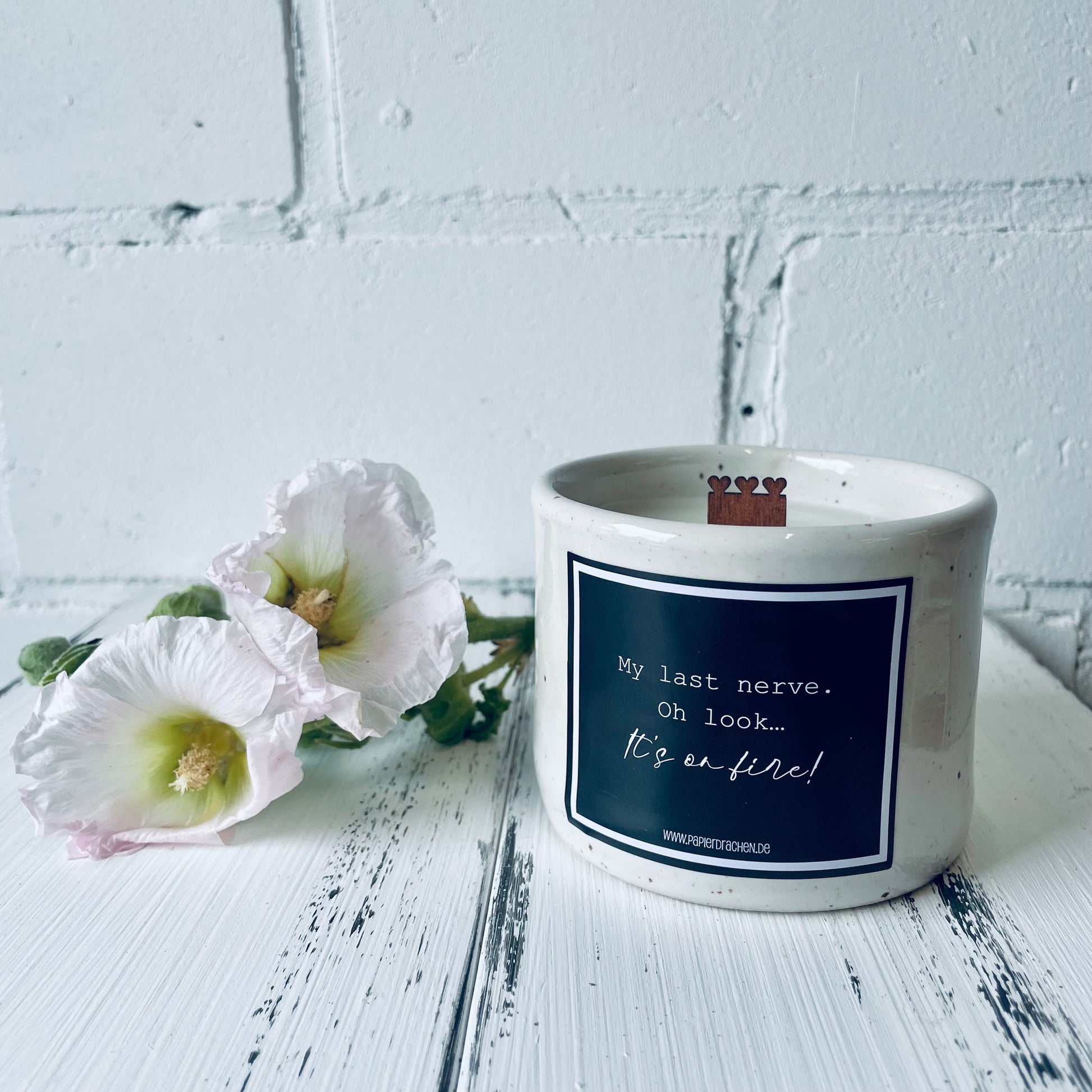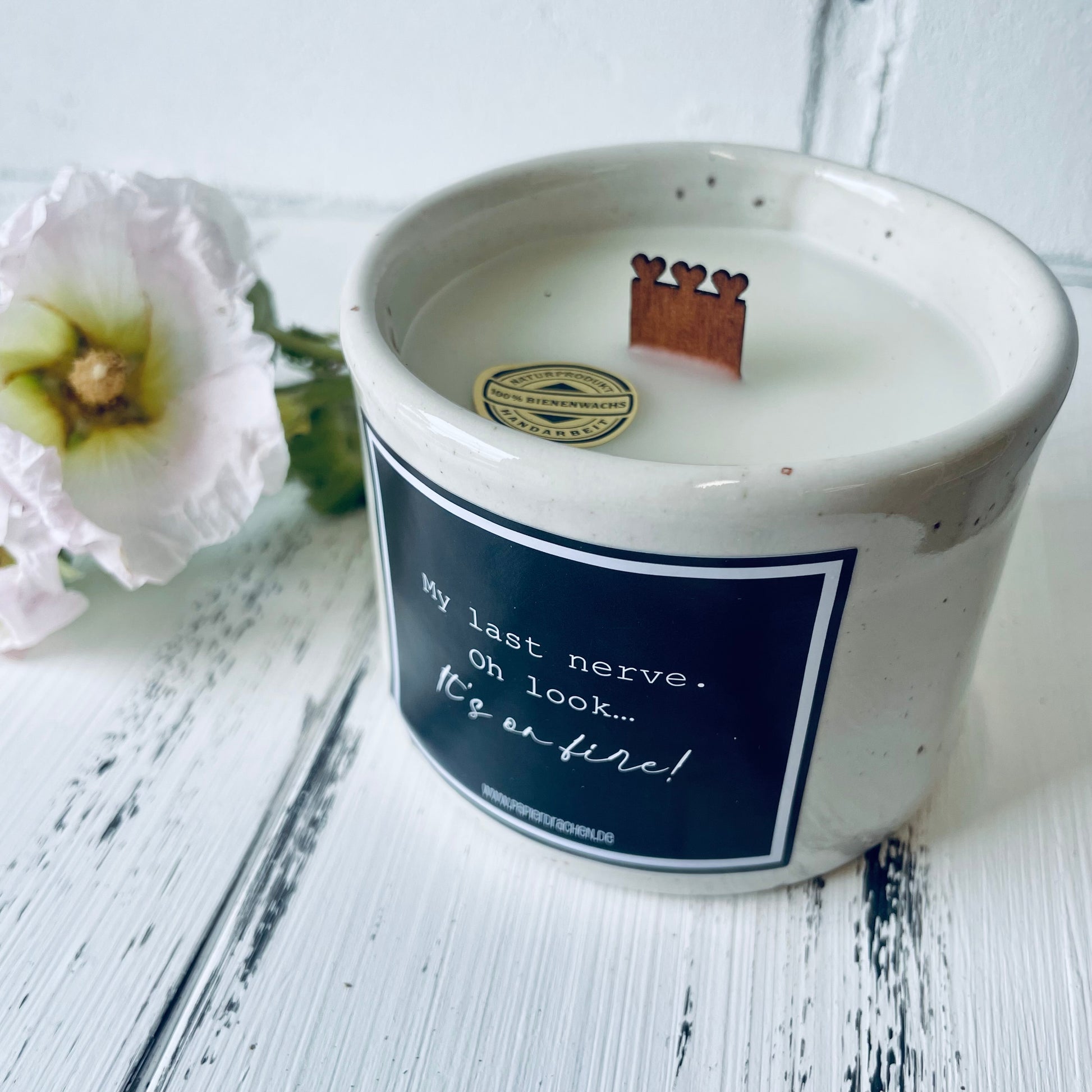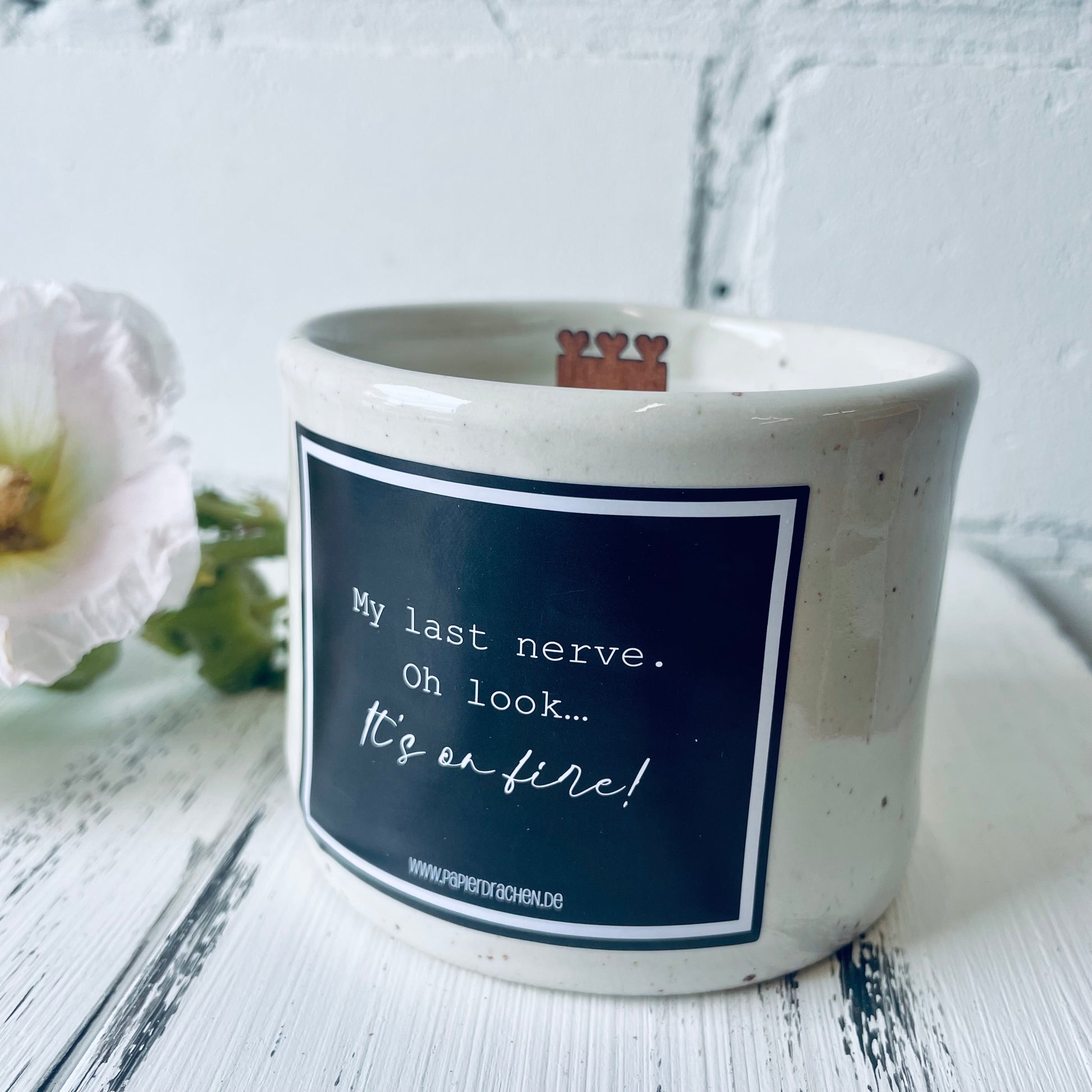 Keramikbecher mit Holzdocht-Kerze – „My last nerve. Oh look… It’s on fire!“, Bienenwachskerze