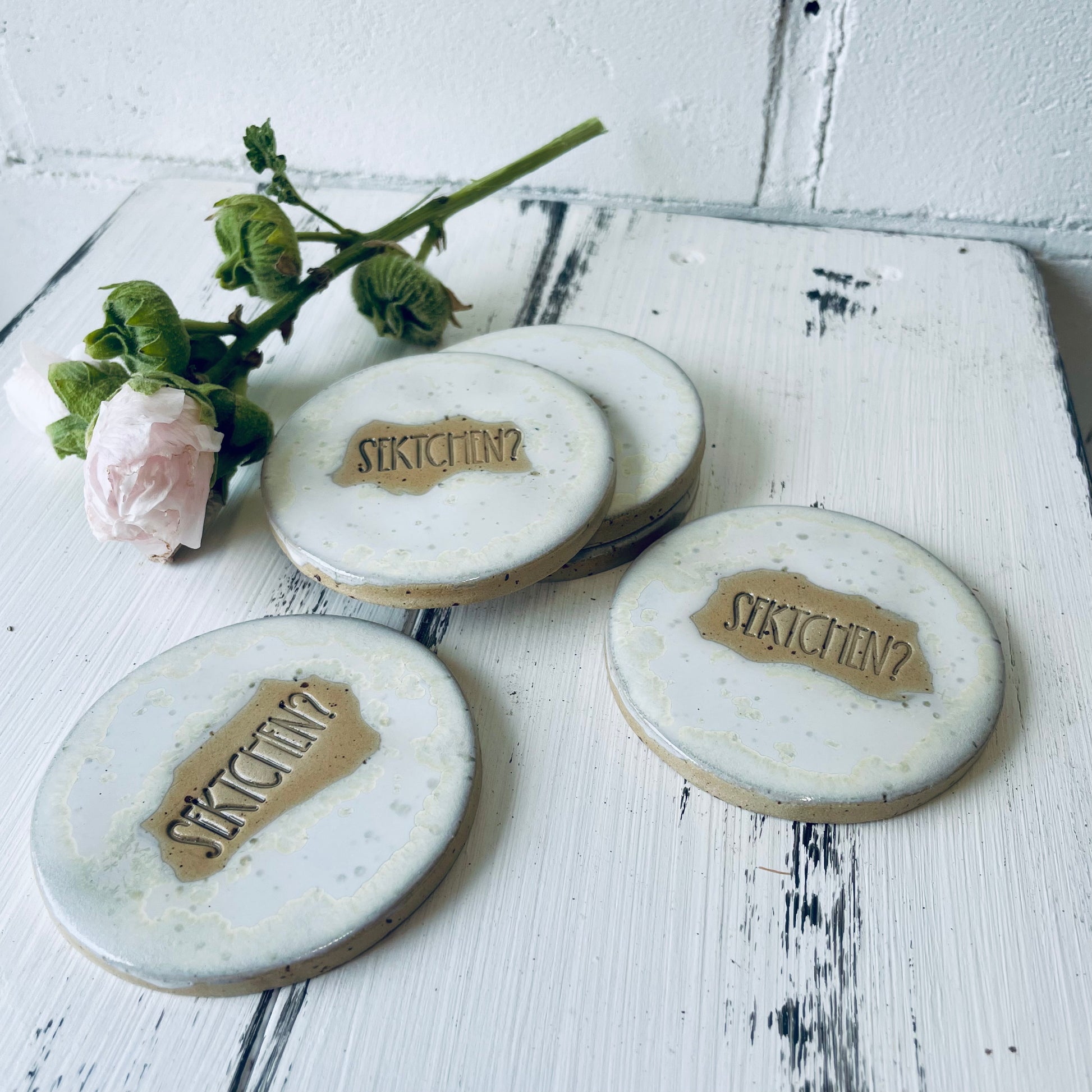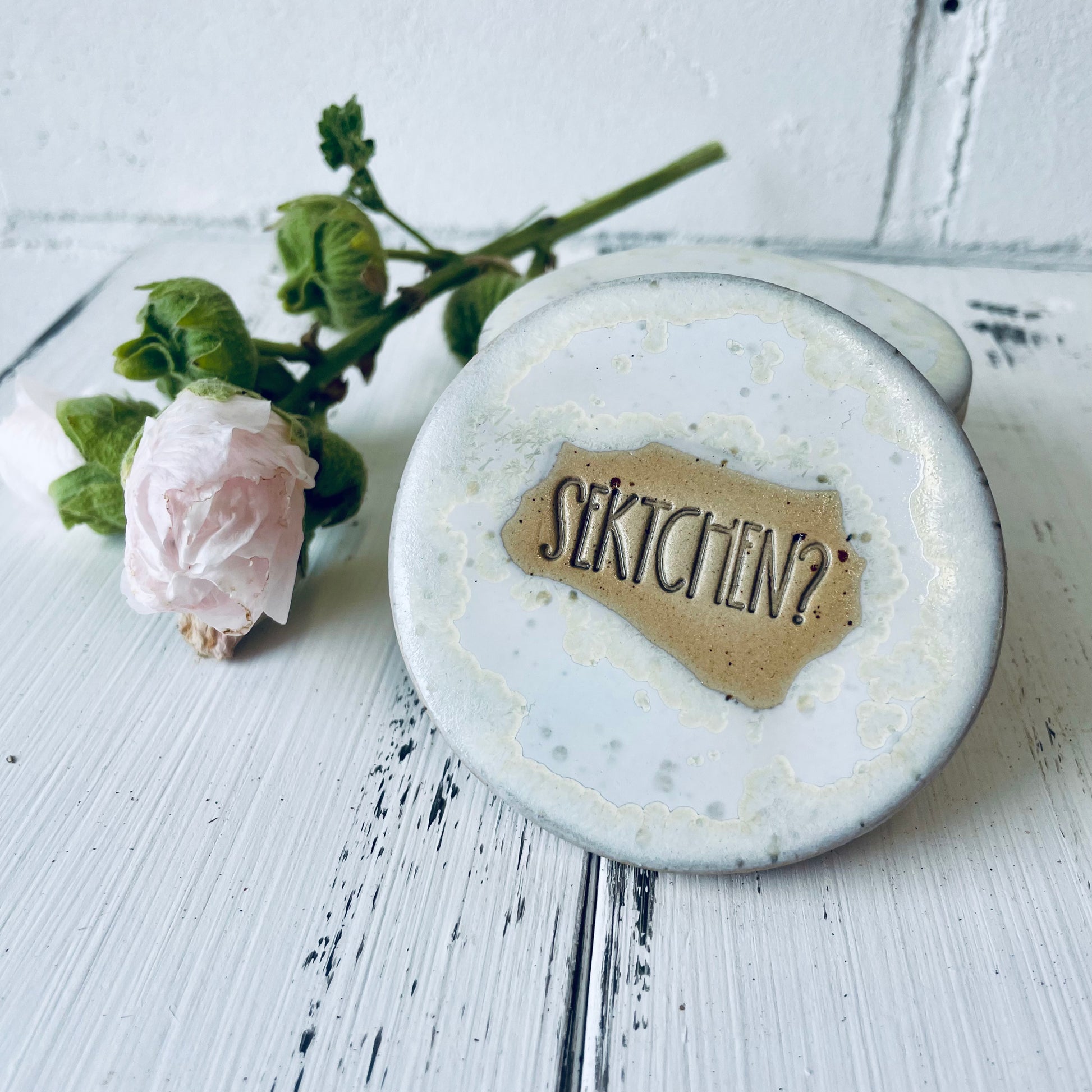 kleiner Handgemachter Keramik-Untersetzer – „Sektchen?“ – perfekt für Mädelsabend & Feierlichkeiten, 7,3 cm Durchmesser