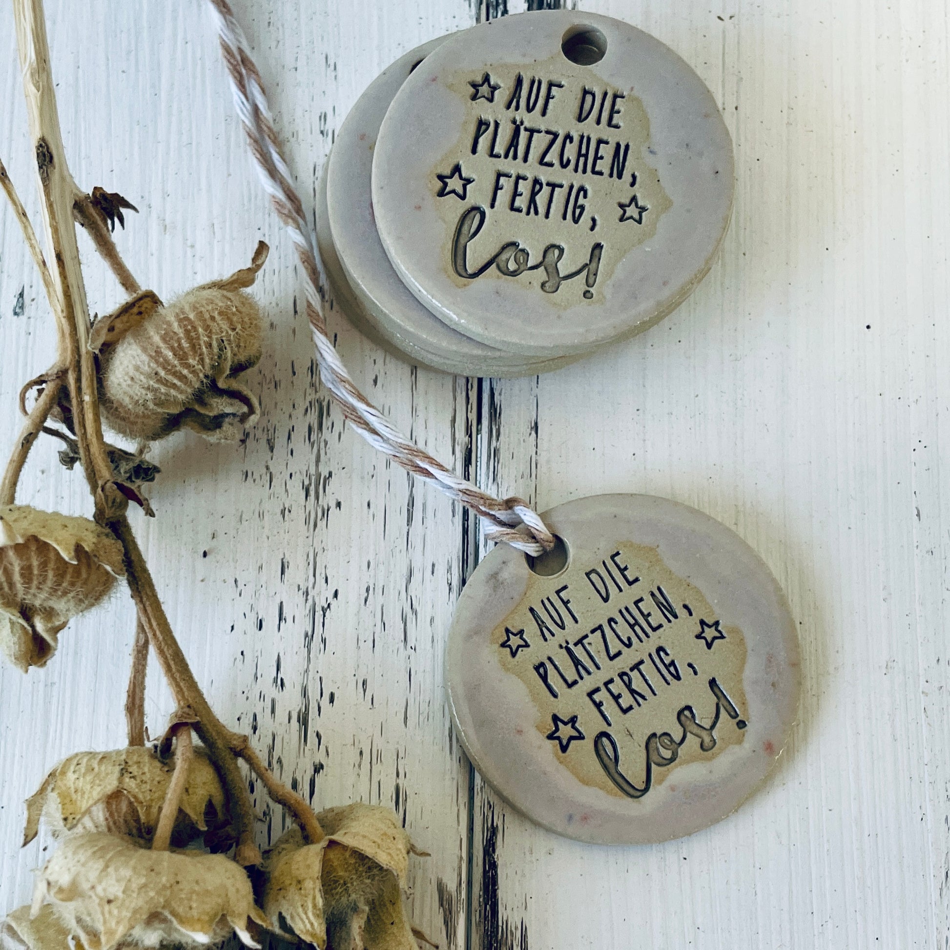 Der runde Keramikanhänger mit der Prägung „Auf die Plätzchen, fertig, los!“ ist handgefertigt aus Steinzeugton und ein liebevolles Detail für Geschenke, Adventspäckchen oder die Küche.