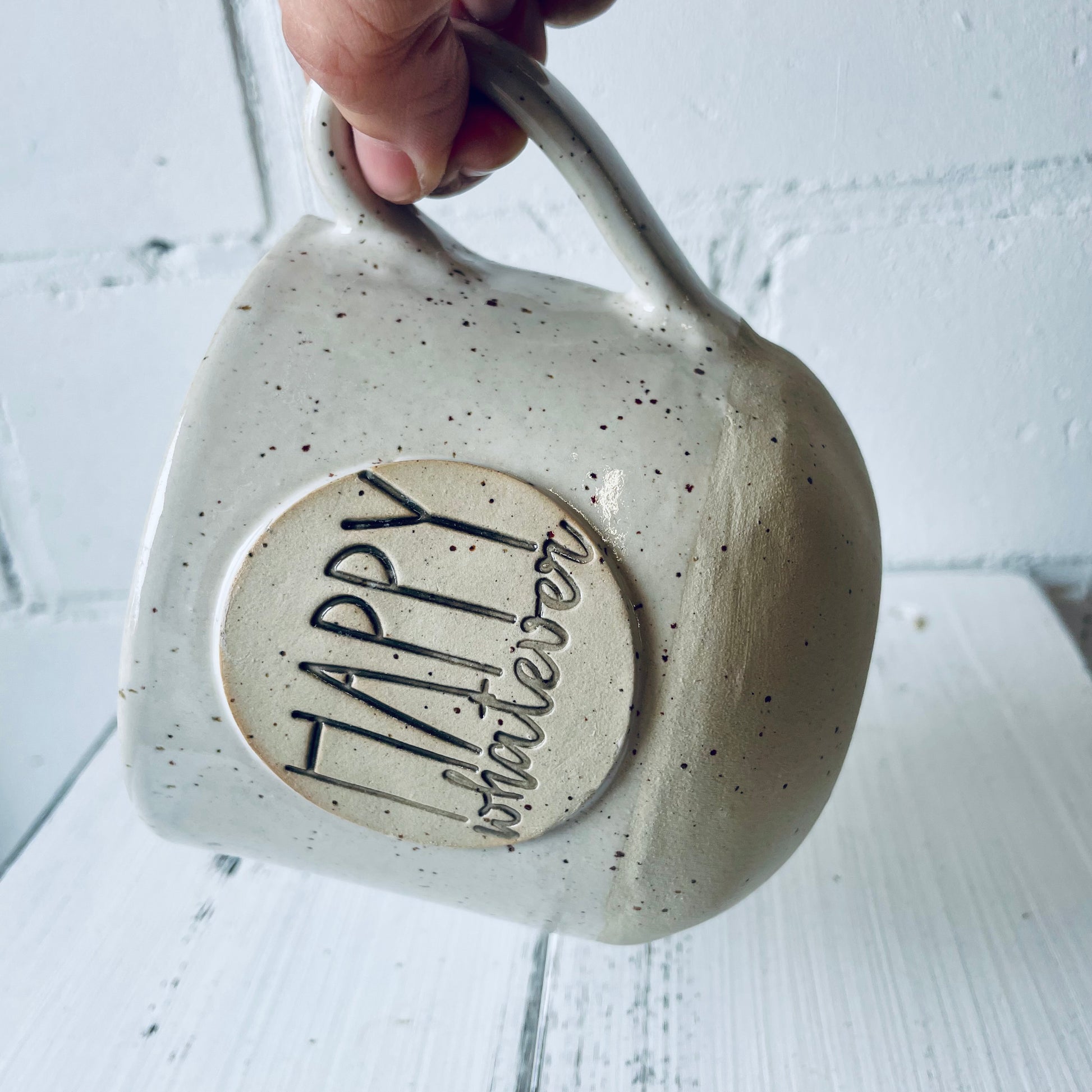 Sprücheklopfer-Tasse mit rundem Boden, Becher mit Spruch, Steinzeugtasse, Tasse mit Spruch „happy whatever“, weiß